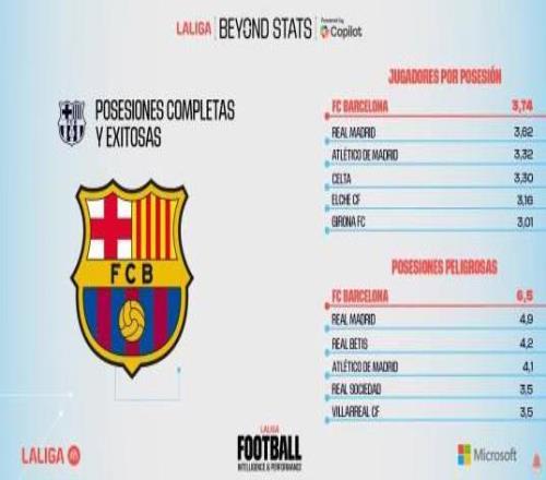 根據(jù)西甲官方列出的統(tǒng)計數(shù)據(jù),巴薩是本賽季西甲射門轉(zhuǎn)化率最高的球隊,也是控球涉及人數(shù)、創(chuàng)造威脅次數(shù)最多,成功阻止對手射門比例最高的球隊。