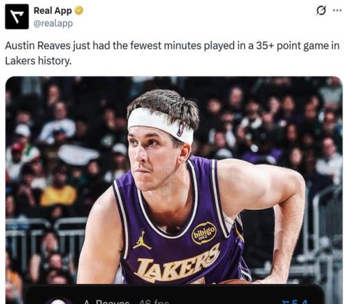 憑借這樣的表現(xiàn),里夫斯成為湖人隊史單場拿下35+得分用時最少的球員。
