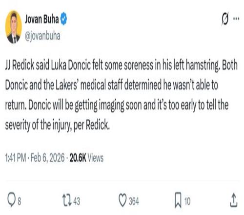 目前判斷傷勢的嚴重程度還為時尚早,東契奇將很快接受影像檢查以確定最終的傷情。