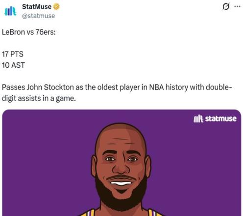 盡管狀態(tài)低迷,但41歲38天的詹姆斯還是超越斯托克頓(41歲19天),成為NBA歷史上單場助攻上雙最老球員。