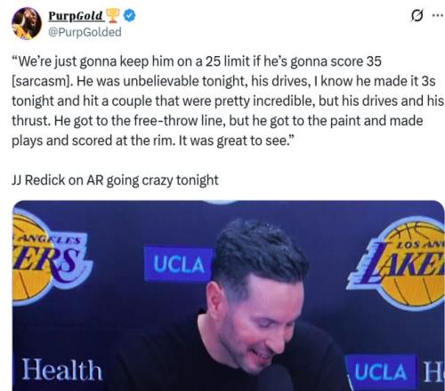 面對里夫斯這樣的表現(xiàn),賽后雷迪克自然不吝嗇溢美之詞:“里夫斯本場的表現(xiàn)無可挑剔,如果他總是能夠拿下35分鐘,我以后就將他的登場時間控制在25分鐘,他的表現(xiàn)簡直不可思議,命中了幾記漂亮的神仙投射,但突破與沖擊力才是關(guān)鍵所在,不僅能夠站上罰球線,還能組織串聯(lián)為隊友創(chuàng)造機會,看到他這樣的表現(xiàn)感覺真是太棒了。”