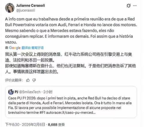 引擎認證的倒計時壓力之外,另一大焦點便是紅牛為何突然與法拉利兩大車隊的意外聯(lián)手?昨晚,巴西名記Julianne帶來重磅爆料:紅牛的倒戈并非單純的規(guī)則共識,而是他們無法復制梅賽德斯的引擎技術,在技術追趕無果的情況下,才選擇將梅賽德斯引擎的相關秘密泄露出去。