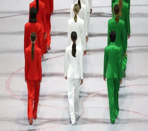 為致敬去年離世的國寶級設計師喬治·阿瑪尼,開幕式特別安排了一場流動的時尚盛宴——60名超模身著阿瑪尼設計的紅、白、綠三色套裝列隊入場,拼出巨幅意大利國旗。壓軸超模維多利亞·切雷蒂(Vittoria Ceretti)手捧國旗,身穿一襲純白色阿瑪尼禮服優(yōu)雅登場,向大師致敬。
