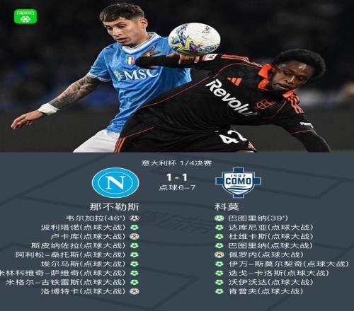 北京時間2月11日意大利杯 1/4決賽,那不勒斯對陣科莫。上半場,奧利韋拉送點,巴圖里納罰入。下半場,韋爾加拉單刀破門扳平比分。90分鐘戰(zhàn)罷,兩隊1-1戰(zhàn)平進入點球大戰(zhàn)。點球大戰(zhàn)中,盧卡庫和洛博特卡失點,那不勒斯最終以總分7-8無緣意大利杯4強。