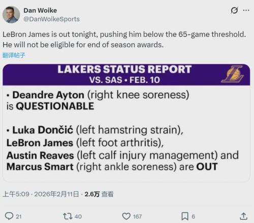 北京時間2月11日上午11點(diǎn)半,湖人背靠背主場迎戰(zhàn)馬刺。賽前湖人官方宣布,四名球員因傷休戰(zhàn):詹姆斯(左腳)、東契奇(左腿筋拉傷)、里夫斯(左小腿)、斯瑪特(右腳踝酸痛)。這是詹姆斯本賽季缺席的第18場比賽!