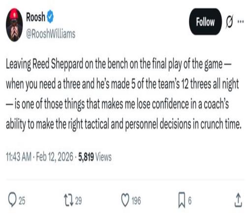 RooshWilliams寫道:“當(dāng)球隊(duì)關(guān)鍵時(shí)刻落后3分時(shí),烏度卡將整晚命中了全隊(duì)12記三分球中5個(gè)的謝潑德摁在板凳席,這種決策讓我對(duì)教練在關(guān)鍵時(shí)刻做出正確戰(zhàn)術(shù)和人員調(diào)整的能力失去了信心?!?/p>