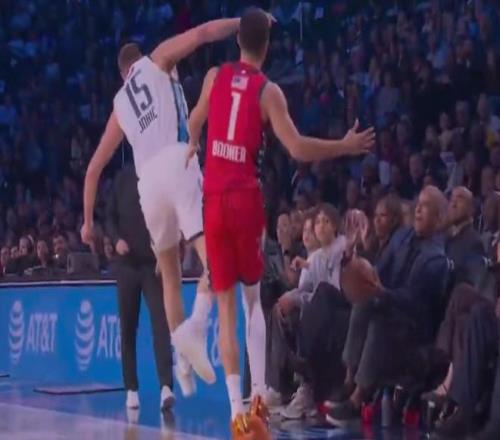前美國(guó)總統(tǒng)奧巴馬也現(xiàn)身比賽現(xiàn)場(chǎng)觀戰(zhàn),并且在比賽中,約基奇和布克爭(zhēng)搶球權(quán)時(shí)把球傳給了奧巴馬。