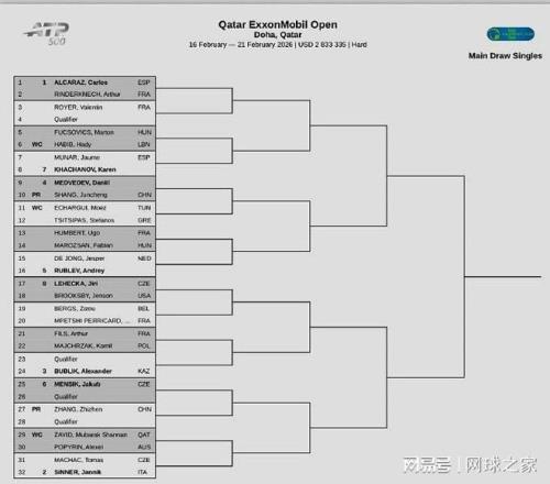 我們再來關(guān)注下周賽事:北京時間昨晚,下周開打的三站ATP賽事相繼公布了正賽簽表。ATP500卡塔爾多哈站:阿爾卡拉斯、辛納、布勃里克三位TOP10領(lǐng)銜,盧布列夫開啟衛(wèi)冕之旅,門???、卡恰諾夫、西西帕斯等名將參賽。中國有兩位球員出戰(zhàn),其中,商竣程首輪對陣俄羅斯名將梅德維德夫;張之臻迎戰(zhàn)一位資格賽球員。