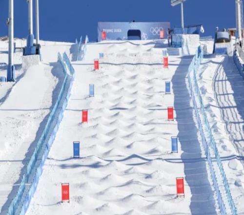 賽道長度被嚴格規(guī)定不能少于250米(普通國際賽事范圍通常在235米±35米),平均坡度要維持在28°±4°,斜面上均勻分布著密集的雪包, 雪包之間的中心距離通常設定在3.5米至4米之間,這個距離是根據(jù)頂尖選手的滑行速度(男選手約11-12米/秒,女選手約10米/秒)計算出來的。除了連貫的雪包,賽道還嵌入了兩個關鍵的空中動作跳臺。第一個跳臺位于賽道總長約15%處,第二個則設在離終點約20%處。|奧運會官網(wǎng)