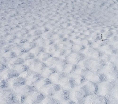 高級雪道地形復雜,坡度較大,通常沒有壓雪車專門整理,只要一場大雪遇上一群人,規(guī)律便產(chǎn)生了:大家習慣在相似的位置轉彎,雪板則不斷將積雪推向外側。隨著時間的推移,小雪包匯聚隆起成小山丘,最終在坡面上刻畫出凹凸相間的槽狀地形。在漫長的冬季里,蘑菇經(jīng)歷著日復一日的自然演變——夜晚凍結定型,午后被陽光曬軟,或是被新雪覆蓋后由后來者重新“雕琢”。如果不加人工干預和整理,整座雪山最終都會被這股力量占領。