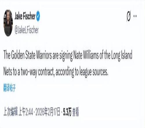 北京時(shí)間2月17日,據(jù)NBA名記Fischer報(bào)道,勇士將與內(nèi)特-威廉姆斯簽下一份雙向合同。